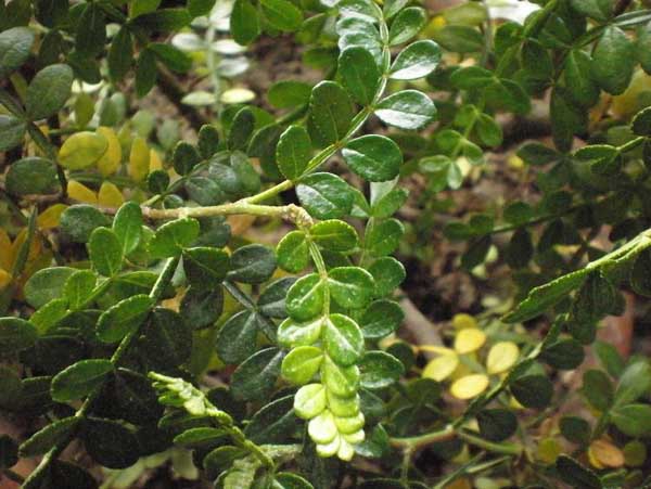 灌木或小乔木,高2-8米,稀达10-15米;树皮灰色,小枝具棕色皮孔,幼枝被灰黄色微柔毛。偶数羽状复叶互生,有小叶4-9对,叶轴具狭翅,上面具槽,被灰色微柔毛,叶柄被微柔毛;小叶革质,长圆形或倒卵状长圆形,较小,长1.3-3.5厘米,宽0.8-1.5厘米,稀较大(5×1.8厘米),先端微缺,具芒刺状硬尖头,基部略不对称,阔楔形,全缘,略背卷,两面中脉上被极细微柔毛,侧脉在叶面微凹,在叶背明显突起;小叶柄极短。花序腋生,与叶同出,被黄棕色柔毛和红色腺毛;花小,紫红色,无梗,苞片1,卵圆形,内凹,径约1.5毫米,外面被棕色柔毛,边缘具细睫毛。