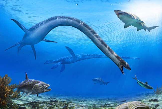 长颈型蛇颈龙主要生活在海洋中,脖子极度伸长,活像一条蛇,身体宽扁,鳍脚犹如四支很大的划船的桨,使身体进退自如,转动灵活。长颈伸缩自如,可以攫取相当远处的食物。