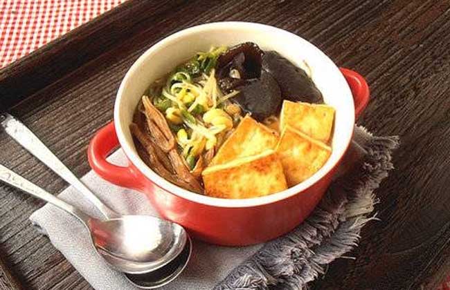 【做法】①干黄花菜用温水泡20分钟左右,清洗两到三次。②将木耳加水用电高压锅压30分钟,取一半,另一半做他用。③热锅倒少许玉米油,煎切成块的豆腐至黄色出锅。④用煎豆腐的余油烧热,下金针菜炒香,再下黑黄豆芽炒软。⑤倒入一半压好的黑木耳、煎好的豆腐和适量水,加素鸡粉和盐炖煮熟即可。