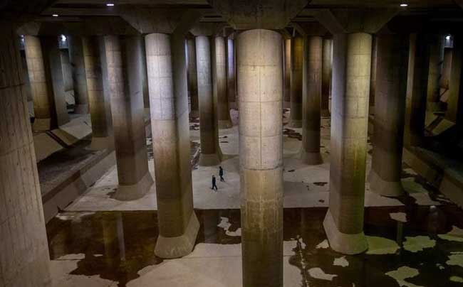“首都圈外围排水系统”全长6.4公里,排水系统包括5个高65米、宽32米的巨型竖井,竖井之间由内径约10米的管道连接起来。前4个竖井里导入的洪水通过下水道流入最后一个竖井,集中到由59根高18米、重500吨的大柱子撑起的巨大蓄水池中。