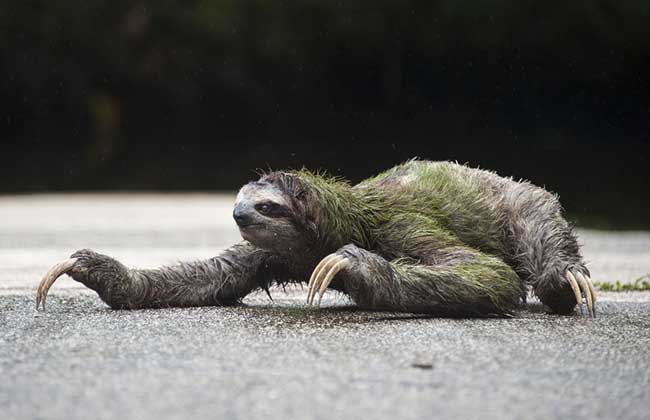 树懒虽然有脚但是却不能走路,靠得是前肢拖动身体前行。毛被蓬松长厚,头短圆,耳小并隐于毛内,尾短,前肢3指,后肢3趾,均有可屈曲的锐爪,前肢长于后肢,上颚有齿5对,下颚4对,共18枚,胃分数室,颈椎9节,为哺乳动物中最多者。体重4~7公斤,体毛长而粗,毛被为藻类提供了生存条件。
