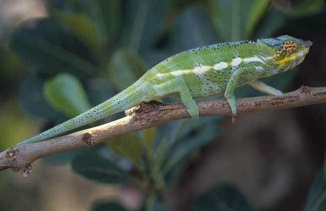 2、变色龙的表皮细胞根据外界光线和温度的变化以及体内化学反应进行扩张和收缩。例如愤怒的变色龙可能会变成嫩黄色,这是因为当它生气时,黄色细胞发生膨胀,阻碍下层的蓝光反射出来。