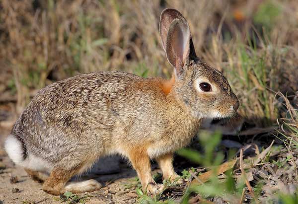 野兔头小,长有一对比家兔小得多的耳朵,与穴兔相比耳朵稍长一些,耳尖呈黑色,成年野兔一般耳长13 厘米,为身长的1/5 ,四肢细长、健壮,后肢十分强健,有力也比普通家兔长,敏捷,胆小,善于奔跑。体型相对于家兔来说要小得多,一般体长35~43 厘米,尾长7~9 厘米,成年野兔一般在2 .5~3 千克左右。
