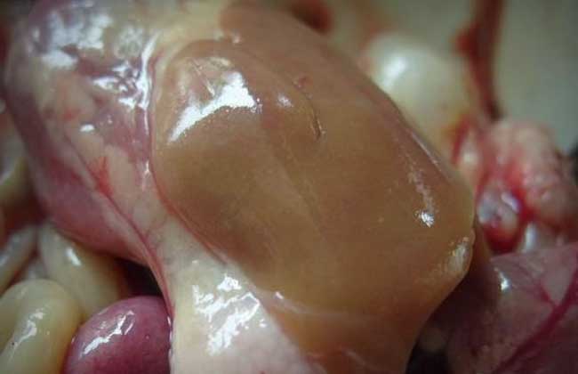 雏鸡群突然大批发病,2~3天内可波及60%~70%的鸡,发病后3~4天死亡达到高峰,7~8天后死亡停止。病初精神沉郁,采食量减少,饮水增多,有些自啄肛门,排白色水样稀粪,重者脱水,卧地不起,极度虚弱、最后死亡。剖检可见法氏囊呈黄色胶胨样水肿、质硬、粘膜上覆盖有奶油色纤维素性渗出物。有时法氏囊粘膜严重发炎、出血、坏死、萎缩。另外,病死鸡表现脱水,腿和胸部肌肉常有出血,颜色暗红。肾肿胀、肾小管和输尿管充满白色尿酸盐,脾脏及腺胃和肌胃交界处粘膜出血。