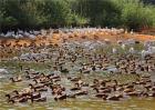 刚刚也说了,野鸭是非常喜欢水的,尤其是雏鸭,所以一定要做好放水工作。一般在雏鸭生长到一星期左右后,便可进行放水。根据野鸭的年龄及环境温度等因素合理调整好放水的频率与时间。在放水后要晾干羽毛才可赶回鸭舍,防止弄湿垫料。在两个月左右后,雏鸭的翅膀已经逐渐成型,逐渐学会了飞行。这个时候要注意检查鸭舍周围的拦网是否完整,防止飞走,高度控制在两米左右,便于管理及捕捉。