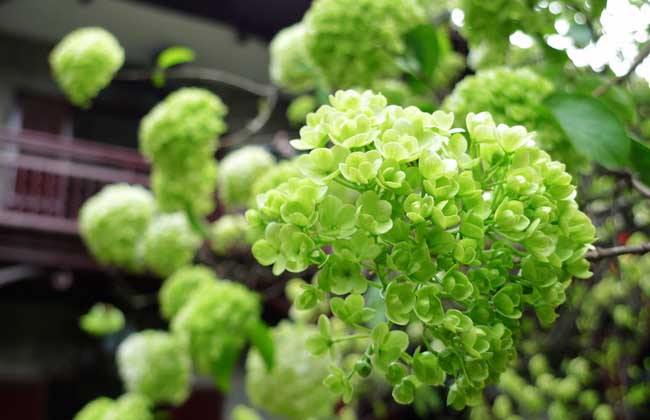 1、琼花:琼花的花期4~5月,聚伞花序生于枝端,周边八朵为萼片发育成的不孕花,中间为两性小花。