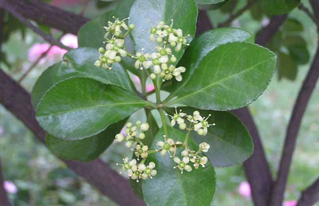2、大叶黄杨:小叶黄杨为灌木,高可达3米,小枝四棱,具细微皱突,叶革质,有光泽,倒卵形或椭圆形,聚伞花序5-12花,花序梗长2-5厘米,2-3次分枝,蒴果近球状,直径约8毫米,淡红色,种子每室1,顶生,椭圆状,长约6毫米,直径约4毫米,假种皮桔红色,全包种子,花期6-7月,果熟期9-10月。
