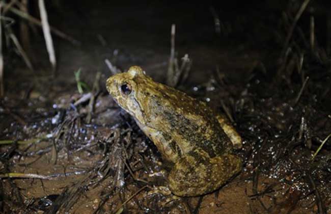 2、牛蛙:牛蛙头部宽扁,口端位,吻端尖圆面钝,眼球外突,背部略粗糙,有细微的肤棱,四肢粗壮,前肢短,无蹼,后肢较长大,趾间有蹼,肤色随着生活环境而多变,通常背部及四肢为绿褐色,背部带有暗褐色斑纹,头部及口缘鲜绿色,腹面白色,咽喉下面的颜色随雌雄而异,雌性多为白色、灰色或暗灰色,雄性为金黄色,鸣声很大。