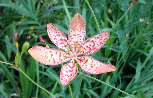 射干的花序顶生,叉状分枝,每分枝的顶端聚生有数朵花,花梗细,长约1.5厘米,花梗及花序的分枝处均包有膜质的苞片,苞片披针形或卵圆形,花橙红色,散生紫褐色的斑点,直径4~5厘米,花被裂片6,2轮排列,外轮花被裂片倒卵形或长椭圆形,长约2.5厘米,宽约1厘米,顶端钝圆或微凹,基部楔形,花期6~8月。