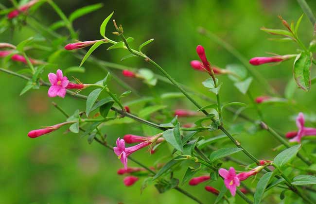 红素馨又叫红花茉莉,攀援灌木,幼枝四棱形,有条纹。单叶互生,卵状披针形,先端渐尖。聚伞花序3花顶生,花冠红色至玫瑰红色,有香气。花和叶同放,花期为5月,产于四川、云南、贵州等省。