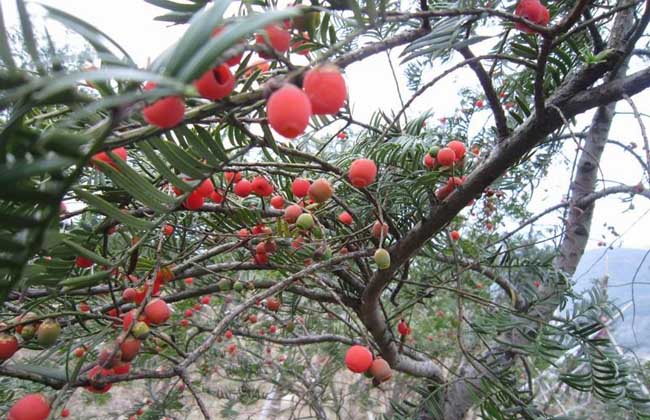 2、云南红豆杉:云南红豆杉别称西南红豆杉,高可达20米,雌雄异株。枝叶茂盛,生命力强。树皮灰褐色、灰紫色或淡紫褐色,裂成鳞状薄片脱落。叶质地薄而柔,条状披针形或披针状条形,常呈弯镰状。种子生于肉质杯状的假种皮中,卵圆形,种脐椭圆形,成熟时假种皮红色。产于云南西北部及西部、四川西南部与西藏东南部,生于海拔2000~3500米高山地带,不丹、缅甸北部也有分布。