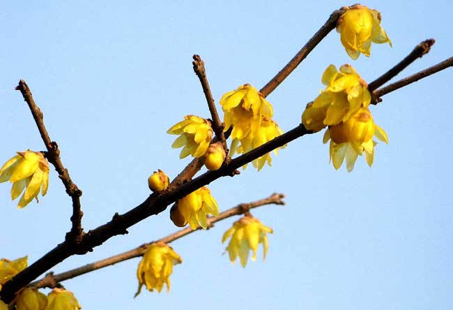 腊梅寒冬开花,清香四溢,庭院栽植最为适宜。腊梅与南天竹搭配,黄花红果,是插花,盆景的好材料。