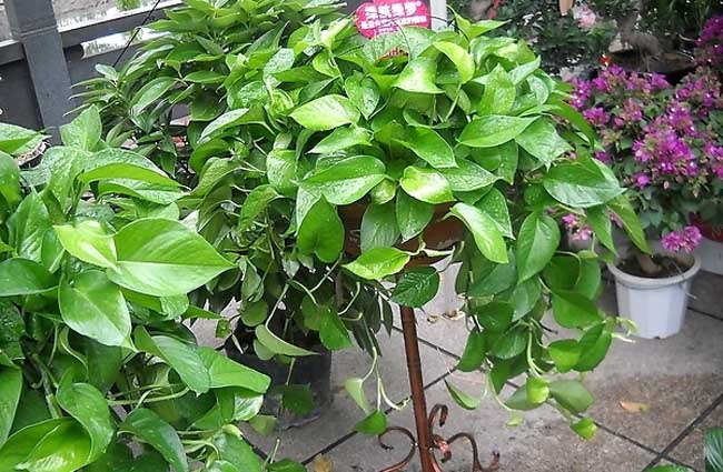 7、整形:每盆栽植或直接扦插4-5株,盆中间设立棕柱,便于绿萝缠绕向上生长。整形修剪在春季进行。当茎蔓爬满棕柱、梢端超出棕柱20cm左右时,剪去其中2-3株的茎梢40cm。待短截后萌发出新芽新叶时,再剪去其余株的茎梢。由于冬季受冻或其他原因造成全株或下半部脱叶的盆株,可将植株的一半茎蔓短截1/2,另一半茎蔓短截2/3或3/4,使剪口高低错开,这样剪口下长出米的新叶能裉快布满棕柱。