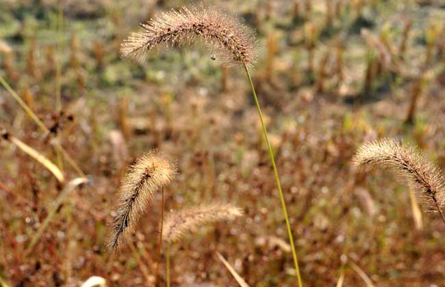 狗尾巴草生于海拔4000米以下的荒野、道旁,为旱地作物常见的一种杂草,种子发芽适宜温度为15~30℃,借风、灌溉浇水及收获物进行传播,经越冬休眠后萌发,适生性强,耐旱耐贫瘠,酸性或碱性土壤均可生长。