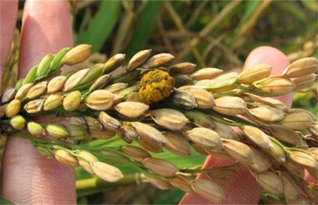 水稻稻曲病是一种真菌性病害,在水稻种植时比较常见,主要危害水稻的穗部,一般发生病害感染时,水稻穗粒内会形成一种菌丝块,这种菌丝会逐渐变大,导致稻粒裂开,仔细观察还回发现有淡黄色鹅块状东西,类似孢子。经过一段时间后这些孢子会裂开,变成墨绿色的粉末,会借风雨传播,导致危害过的稻穗或稻粒,则不能继续的正常生长。