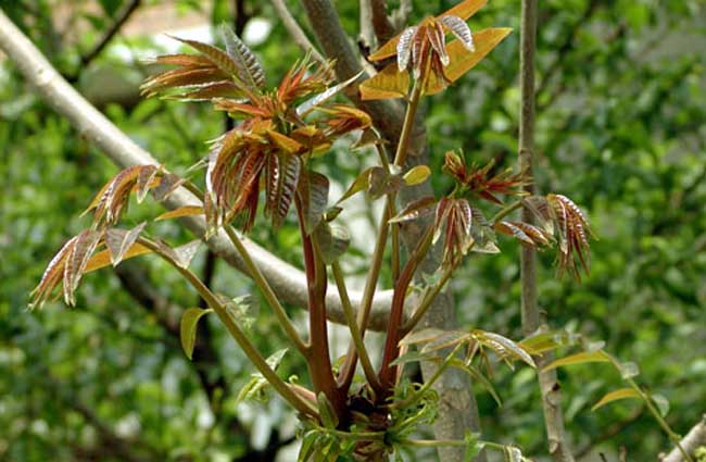 4、根蘖繁殖。香椿的根部具有许多不定芽,在自然环境下,树冠周围常萌发一些幼小树苗,可挖掘出移栽培育新株。但是自然萌蘖有限,可采用人工断根分蘖进行繁殖。其方法:早春解冻后,萌芽前,有树冠外缘,挖50~60厘米的沟,将根末稍切断,用土将沟填好,这样可刺激根先端形成大量蘖苗,萌发新株,翌年即可移栽。