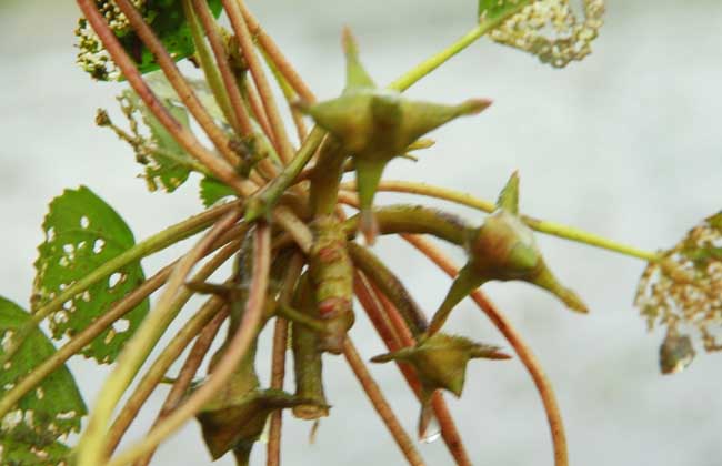 3、蝙蝠菱:产于南京附近,早熟品种,清明播种,处暑、寒露采收,生长势较弱,叶表面淡绿,背面赤褐色,果形中等,皮色有红、绿两种,每斤约40个。