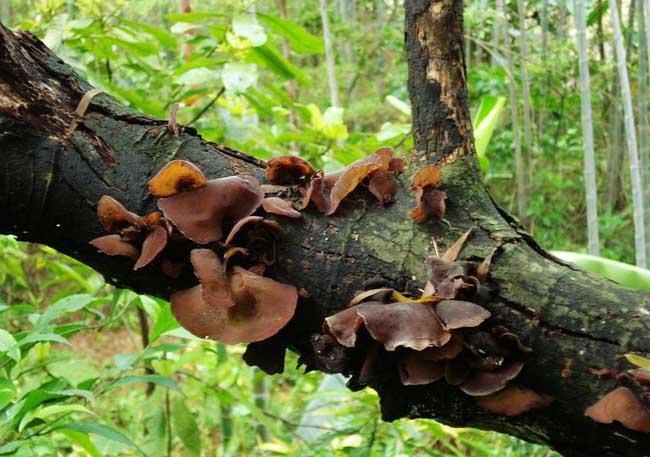 木耳主要生长在中国和日本。中国大部分是东北木耳和秦岭木耳。其中以四川通江黑木耳为最优,自古被誉为圣品,多次进献皇宫,2005年获温家宝总理亲自考察调研。木耳既可野生又可以人工培植,种子实体呈耳状、叶状或杯状、薄、边缘波浪状,宽3-10厘米,厚2毫米左右,以侧生的短柄或狭细的附着部固着于基质上。色泽黑褐,质地柔软呈胶质状,薄而有弹性,湿润时半透明,干燥时收缩变为脆硬的角质近似革质。味道鲜美,可素可荤,营养丰富。