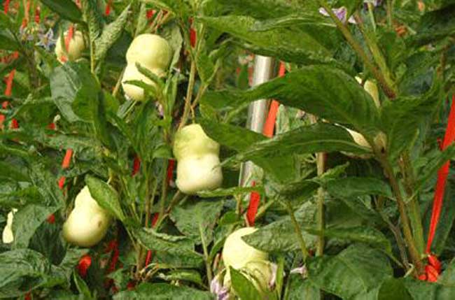 人参果的果实累累,枝条不堪负重, 故必须用竹杆塔架将枝条固定。