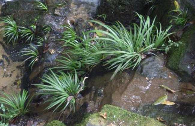 2、根茎繁殖:石菖蒲根茎繁殖在春季进行,挖出根茎,选带有须根和叶片的小根茎作种,按行株距30×15厘米穴栽,每穴栽2~3株,栽后盖土压紧。