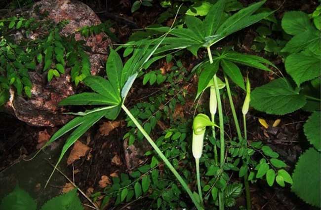 4、套作:天南星栽后,前两年生长较缓慢,在畦埂上按株距30厘米间作玉米或豆类,或其它药材。既可为天南星遮荫,又可增加经济效益。