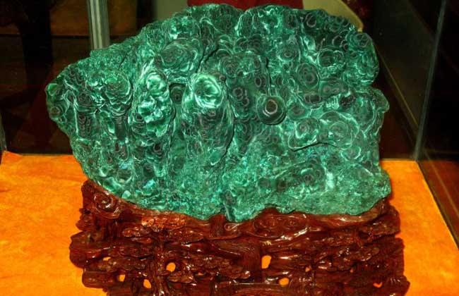 孔雀石是含铜的碳酸盐矿物,化学成分为Cu2(OH)2CO3,主要成分为氧化铜71.9%、二氧化碳19.9%、水8.15%,属单斜晶系,晶体形态常呈柱状或针状,十分稀少,通常呈隐晶钟乳状、块状、皮壳状、结核状和纤维状集合体,具同心层状、纤维放射状结构,颜色有绿、孔雀绿、暗绿色等,常有纹带,丝绢光泽或玻璃光泽,似透明至不透明,折光率1.66~1.91,双折射率0.25,多色性为无色、黄绿、暗绿等,硬度3.5~4.5,密度3.54~4.1克/立方厘米,性脆,贝壳状至参差状断口,遇盐酸起反应,并且容易溶解。