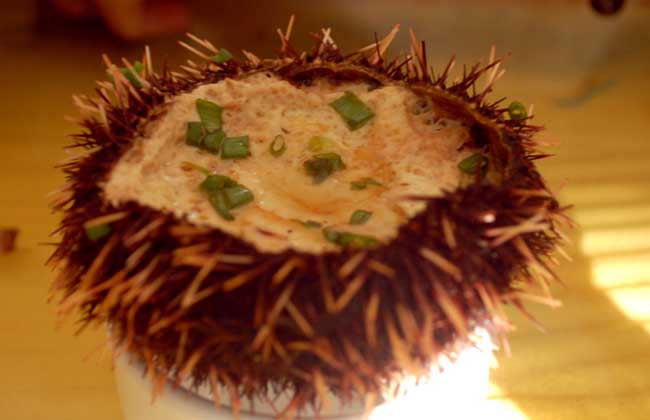 【做法】①在海胆壳顶端,清理出半个壳大小的口,取出海胆的内脏,留下海胆卵,然后淋上柠檬汁、生抽、辣芥酱混合的汁。②吃的时候轻轻摇匀,让调味汁充分浸透到海胆四周。有多鲜美,吃过就知了。