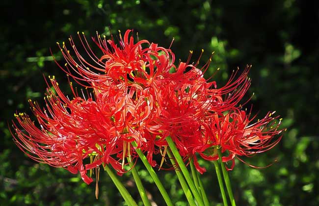 1、曼珠沙华:曼珠沙华(红花石蒜)是石蒜的一个变种,多年生草本植物,地下茎肥厚,叶线形,于花期后自基部抽生,花葶高30-60厘米,伞形花序顶生,花鲜红,花筒较短,花被片狭倒披针形,向外翻卷,雄蕊及花柱伸出,姿态秀丽,花期7月~9月,盛开在七月,生长于夏日。