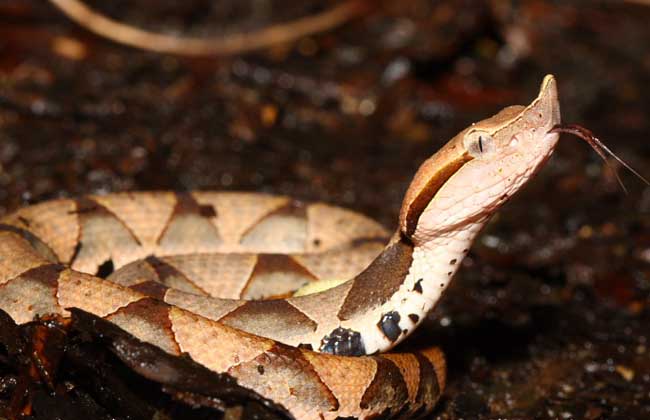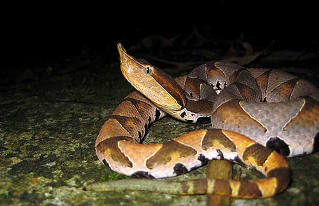 2、活动:百步蛇年活动周期自惊蜇至大雪约为9个月,影响活动的主要因子是温度、湿度及食物,气温20~30℃时,活动最频繁,气温高达35~38℃时,多向水边集中,在夜间用松把照明较为敏感并对火把有攻击反应,用手电筒照时几乎无明显趋温倾向。