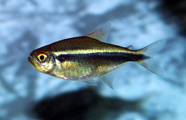 6、蓝眼灯鱼:蓝眼灯鱼别名女王蓝眼灯,眼睛呈鲜蓝色,在黑暗中会发出迷人的蓝光,故俗称为女王蓝眼灯,因它迷人的外表及娇小的体型和灯科鱼相似,所以我们常把它归为灯鱼,其实分类上它属于鳉鱼科,和青鳉等鱼的亲缘关系更近,性情温和,群游性十分强,草缸中常用的造景鱼类,也是市场上广受人们喜爱且普及的非洲小型灯鱼。