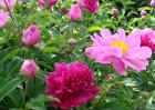 2、分株繁殖:分株繁殖是将一棵牡丹分成数棵小牡丹进行栽植的方法。分株多在"秋分"至"寒露"期间进行,分株时可将4~5年生的牡丹棵挖出,去掉附土,日晒1~2天,让其根部失水变软,按自然生长势从根部(五花头处)劈成数棵,每棵需带有部分细根,植株大、芽子多的可分株多一些,否则就少分。分株后的小棵就根据"五花头"上的芽子多少进行修剪老枝,有2~3个芽的老枝宜留10厘米,5~7个芽的老枝宜留5~7厘米。只有一个嫩芽的可不修剪。剪枝后还要修剪根部,将粗根和中等根剪去(作丹皮加工入药),小根或细根全部留下,小根细根少的可留粗根或不剪。若发现有病株,可用药浸根后栽植。