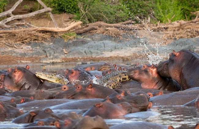 河马牙齿容易刺穿鳄鱼皮。河马牙齿很大,门齿和犬齿呈獠牙状,下门齿不是向上生长而是向铲子一样平行伸出,长度可达60~65厘米,重量为2~3千克,犬齿的长度也达60厘米左右,而且硬度极高甚至可以弹开普通手枪子弹,这样强大的牙齿还会惧怕鳄鱼?