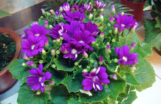 2、阳光:瓜叶菊在生长期内喜阳光,不宜遮荫。要定期转动花盆,使枝叶受光均匀,株形端正不偏斜。花朵萎谢后植株仍需适度光照,以适应种子发育。