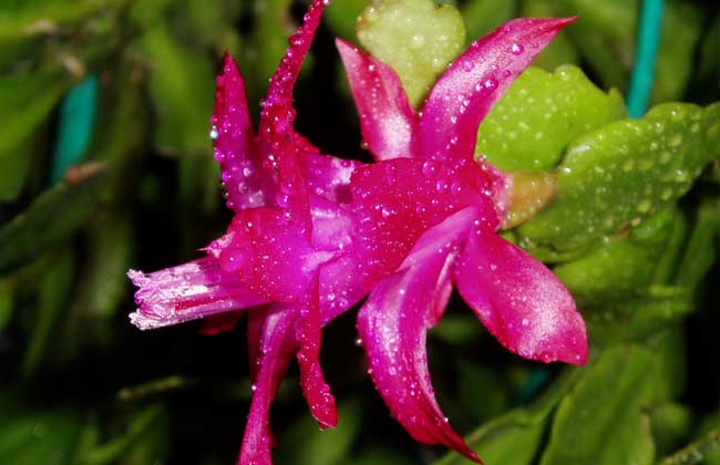4、搭支架:嫁接蟹爪兰成活后,一般经过一年左右的生长,蟹爪兰就会环绕在仙人球周围,这时候需要做上支架,使蟹爪兰像喷泉一样悬挂在仙人球上。