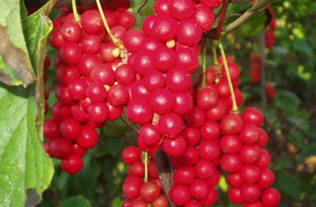 五味子实生苗5年后结果,无性繁殖3年挂果,一般栽植后4~5年大量结果,8~9月果实呈紫红色摘下来晒干或阴干,适时采收很重要,否则涉及到产量和质量。采早商品质量差,采晚熟的太过,果皮易破裂,晒晾不方便。晒果方法是:席子底下垫树枝,席上放3厘米厚的五味子,晒3~5天果皮有皱纹,轻轻搅动,经2~3周即晒干。采收季节遇阴雨天,要用微火烘干,但温度不能太高,否则挥发油易挥发,果粒变焦。