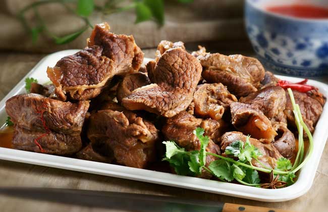 【做法】①用流水洗净牛腱肉表面污物,整块放入凉水锅中大火煮,煮沸后将水面的血沫撇去,边煮边撇,约15分钟左右,内中的血水就清除干净了。捞出肉块沥干水分。②将牛腱肉放入汤锅中,加入热水至完全没过肉面,放入酱油、黄酱、盐、糖、料酒、葱段、姜片和状入纱布袋的花椒、大料、桂皮,盖盖大火煮半小时,然后调小火炖2小时以上,最后揭起锅盖再用大火炖15分钟,使肉块均匀入味。③捞出牛腱肉,在大碗上架一双筷子,将肉放在上面沥水晾凉。④牛肉彻底放凉后表面发紧,就可以切片了。切时应逆着肉丝纤维的方向,且承薄片装盘即可。