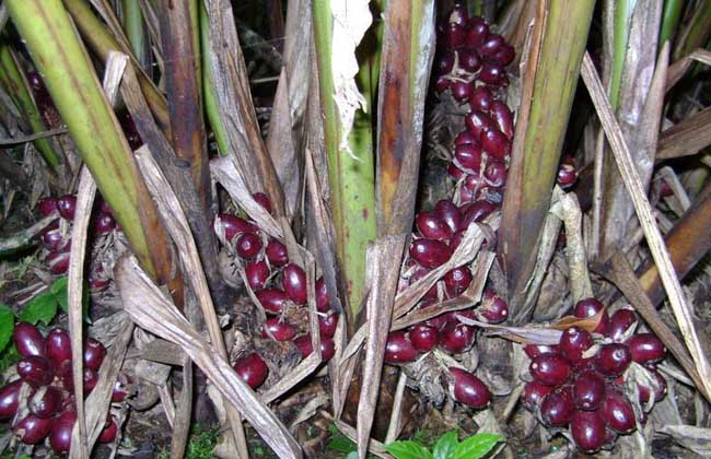9、采摘烘干:草果在10~11月果实开始成熟,变为红褐色而未开裂时采收,晒干或微火烘干。