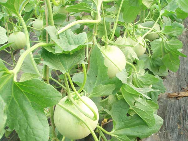 7、铺草翻瓜:果实接触地面,易受黄守瓜幼虫危害.造成品质下降或减产,故而引蔓时蔓下铺草。瓜长至半大时,适时翻瓜,亦有利于避虫害,且能使甜瓜着色和风味一致。