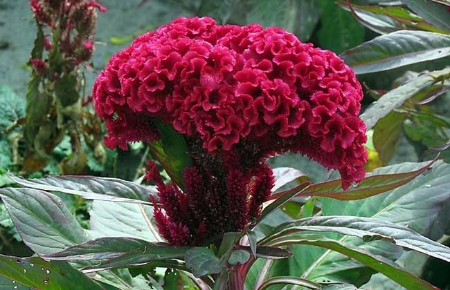 2、苗期管理:鸡冠花苗高2寸,按行距1尺,株距8寸间苗,间下的苗可移载其它田块,移载后一定要浇水。幼苗期一定要除草松土,不太干旱时,尽量少浇水,苗高尺许要施追肥一次。封垅后稍适当打去老叶,开花抽穗时,如果天气干旱,要适当浇水,雨季低洼处严防积水。抽穗后可将下部叶腑间的花芽抹除,以利养分集中于顶部主穗生长。